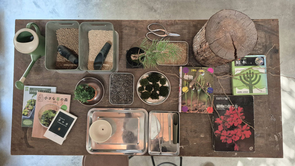 植物や苔や実物の木や根、植物の本など